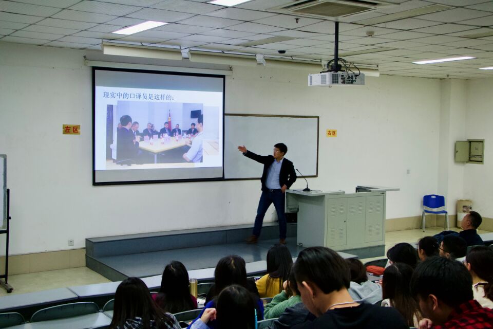 刘老师在讲座中根据自己口译实战经验,为同学们总结了一系列口译的技巧与方法,并和同学们分享了自己在口译中所遇到的趣事,其风趣的语言及优雅的谈吐吸引着在场的所有听众,为本场讲座营造了轻松愉快的氛围,练习短时间记忆的游戏更是将讲座带入了高潮。此外,刘老师还着重讲了听力中做笔记的方法。有同学觉得自己不做笔记时听力听得更明白,但其实是因为自己的听力水平还比较低。刘老师建议边看演讲边做笔记,第一次听时找出演讲者的演讲框架与演讲脉络,之后再听细节。侃侃而谈的同时,刘老师还给同学们播放了有趣的视频,以便让我们更直观地体会到口译任务的艰巨。讲座后的互动提问环节,同学们都踊跃积极发言,并提出自己在学习中的困惑和难点,刘老师也给同学们一一作出了耐心解答。