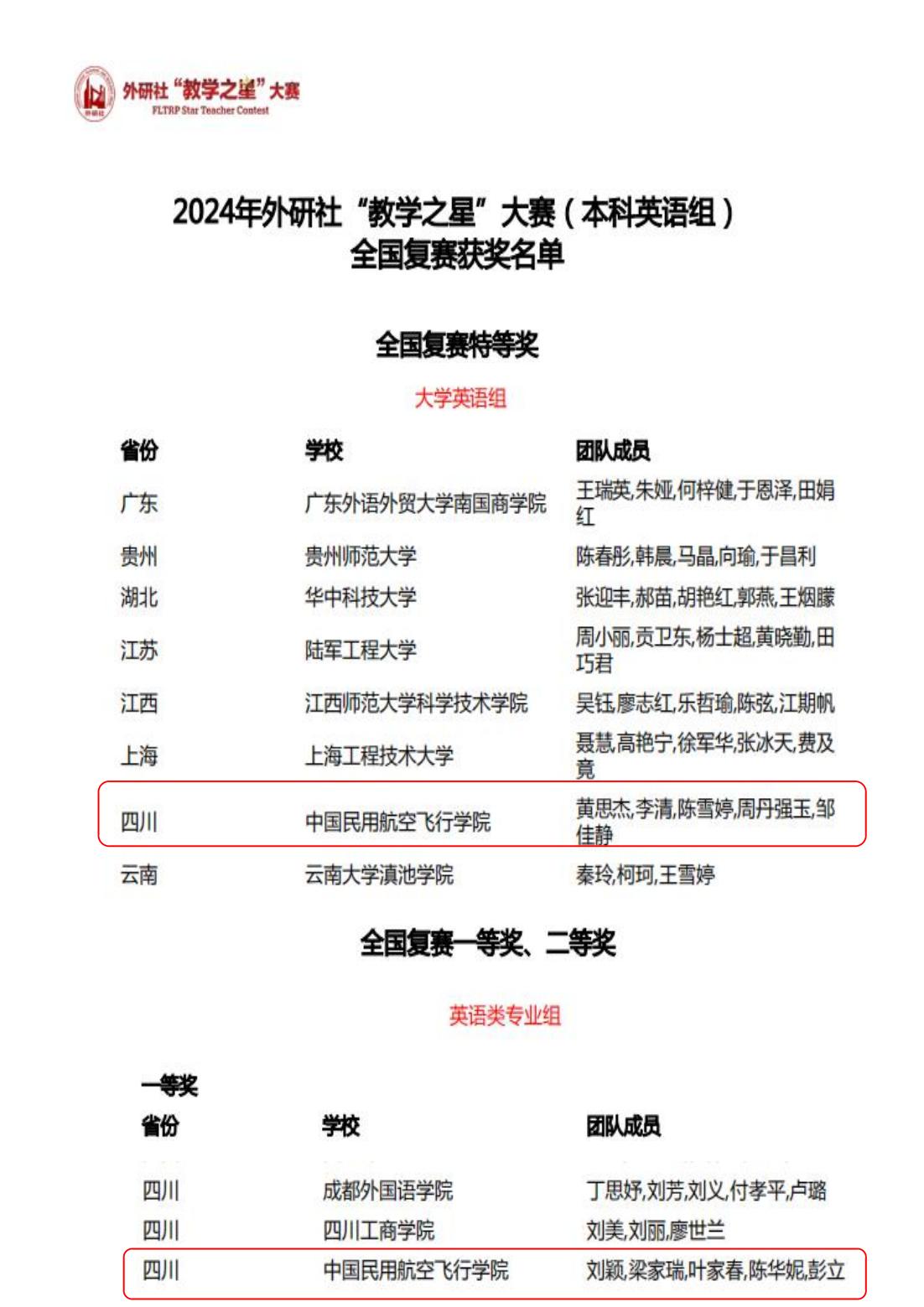 6月20日晚,2024年外研社“教学之星”大赛主题为“外语教材的有效使用:数智融合,创新育人”全国赛晋级名单及获奖名单正式公布。经全国各院校选拔推荐,组委会共收到本科英语组全国复赛参赛材料638份,其中大学英语组321份、英语类专业组168份、“理解当代中国”组149份。我校beat365官方网站的两支教师团队,大学英语组黄思杰老师、李清老师(团队成员陈雪婷、周丹强玉、邹佳静)凭借出彩的课程设计、扎实的授课功底荣获外研社“教学之星”全国复赛特等奖,顺利晋级国赛,英语类专业组刘颖老师、梁家瑞老师(团队成员叶家春、陈华妮、彭立)也获得了全国复赛一等奖的优秀成绩。