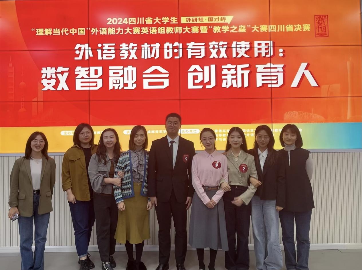 外研社“教学之星”大赛在全国高校外语教学领域备受认可,连续多年被纳入中国高等教育学会“高校竞赛评估与管理体系研究”《全国普通高校教师教学竞赛分析报告》中的全国重点赛事数据来源。本次比赛以“外语教材的有效使用:数智融合,创新育人”为主题,四川赛区共有23个参赛团队激烈角逐晋级名额,最终9组晋级团队在成都师范学院不分组别同台竞技。专家评委对我校团队运用的数智技术给予高度赞扬,对团队创新的教学设计也评价颇高。