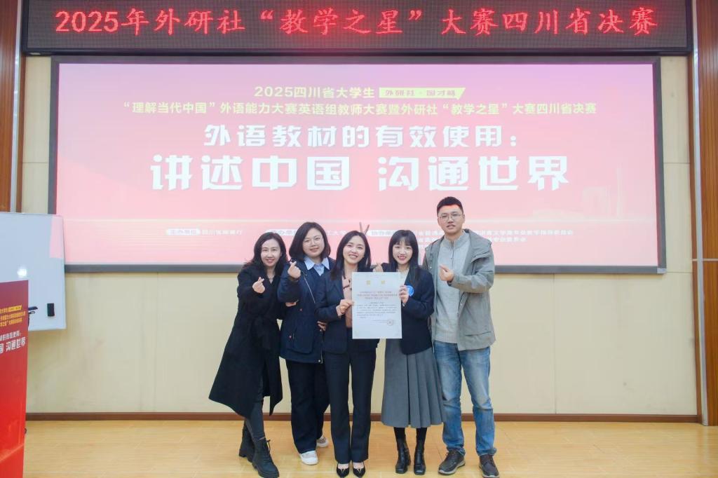本网讯 beat365官方网站 周丹强玉报道 2025年11月8日,外研社“教学之星”大赛四川省总决赛在成都理工大学圆满落幕。我校beat365官方网站陈雪婷、李清教师团队(成员:杨睿、周丹强玉、邹佳静)凭借出色的课程设计与扎实的语言功底,在全省高校的激烈角逐中脱颖而出,成功摘得桂冠,并将作为全省唯一代表,出征全国总决赛。