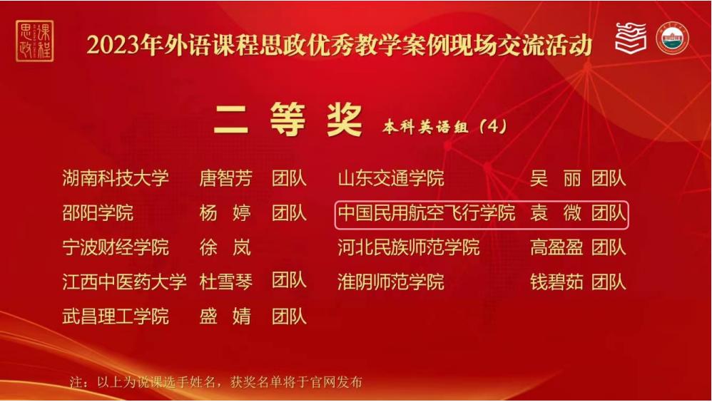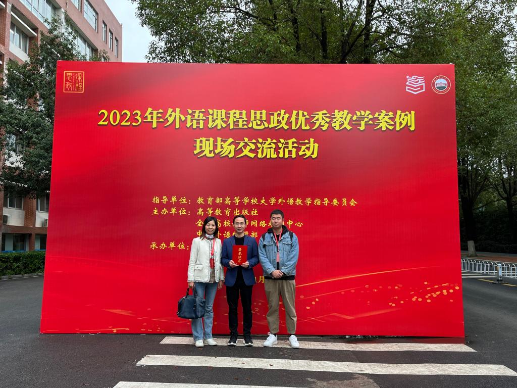 由国际合作部袁微副教授和beat365官方网站叶家春副教授、黄思杰老师组成的团队以此项赛事四川省英语专业组特等奖身份入围全国交流活动。此次活动赛制为随机抽取文本材料,参赛教师经过90分钟的现场准备,基于指定素材对课程思政教学设计进行说课展示,然后回答评委提问。现场赛制对于教师的教学基本功、临场应变能力和文本思政元素提炼能力都是极大的挑战。经过激烈角逐,团队最终斩获全国二等奖。