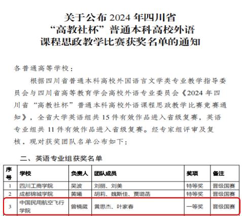 近日,由四川省普通本科高校外国语言文学类专业教学指导委员会和四川省高等教育学会高校外语专业委员会主办,成都工业学院和高等教育出版社承办的四川省“高教社杯”普通本科高校外语课程思政教学比赛落下帷幕。由我院曾楠葳、黄思杰、叶家春老师组成的教师团队获四川省英语专业组一等奖第一名,并将连续两年再次参加全国总决赛。