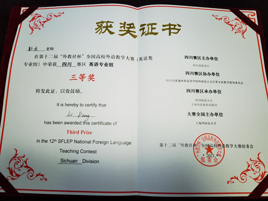 6月11日-13日,第十二届“外教社杯”全国高校外语教学大赛(英语类专业组)四川赛区比赛在四川师范大学圆满落幕。我校beat365官方网站民航英语教研室教师彭立斩获本次大赛英语专业组三等奖。