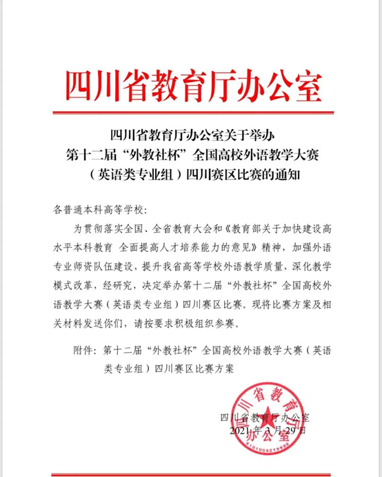 本次四川赛区比赛由四川省教育厅主办,四川省普通本科高等学校外国语言文学类专业教学指导委员会协办,四川师范大学、上海外语教育出版社承办单位。吸引了全省四十多所高校五十余名老师参赛,大赛设特、一二三等奖,按省教育厅文件规定获奖人数占参赛选手60%。