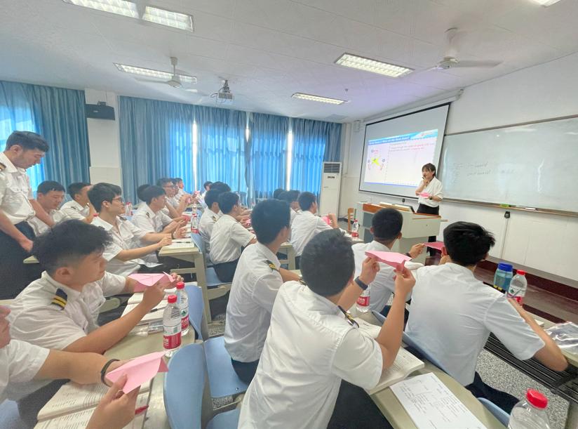 在课程后半段,丁琳老师设计了一个随堂检测,让学生分组利用自主制作教具“纸飞机”,结合所学内容,“操作”纸飞机,用英语有效输出飞行操纵面、位置及作用,基本飞行操纵等内容,学以致用。