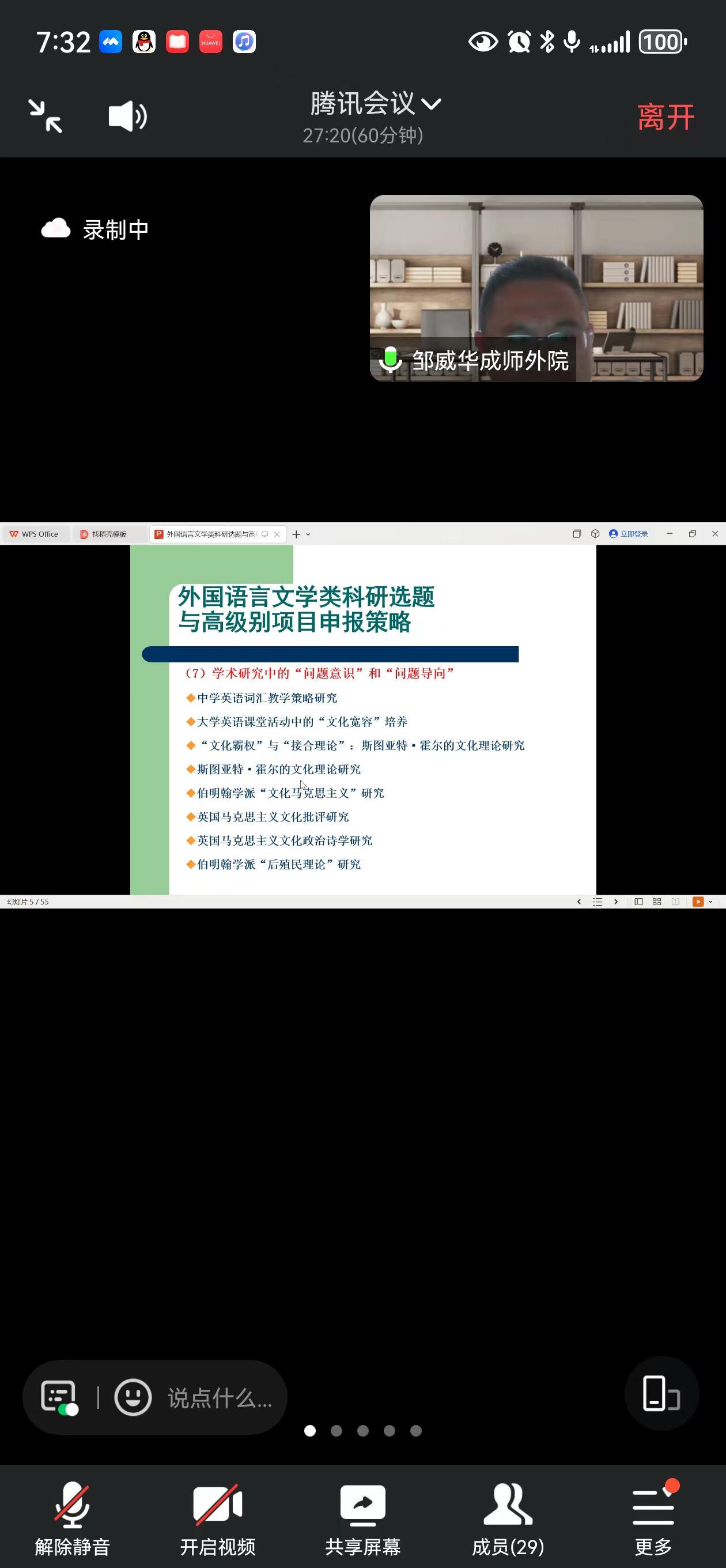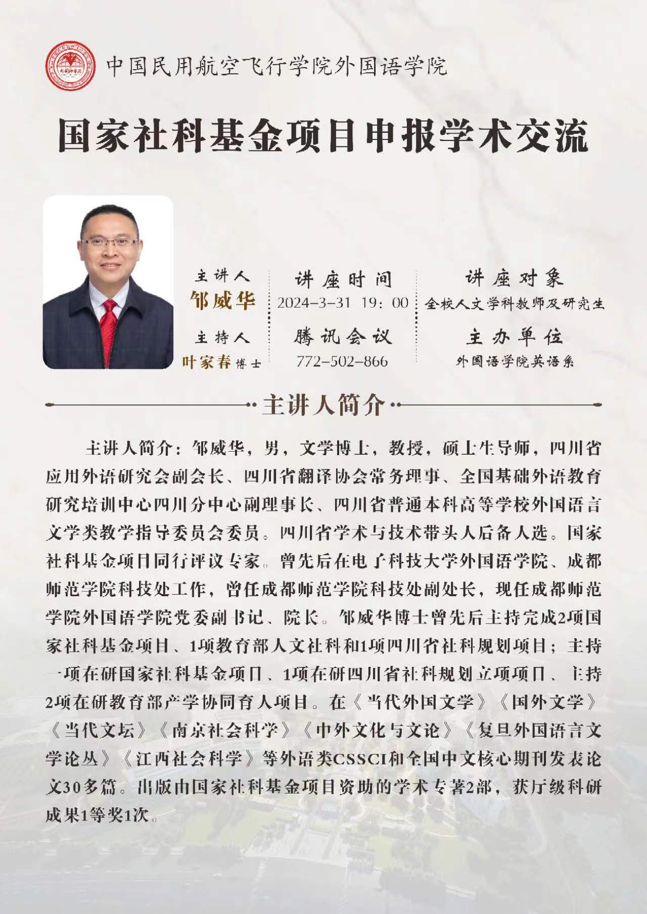 2024年3月31日晚上7点,beat365官方网站全院老师和研究生一起相聚云端,参加英语系主办的关于国家社科基金项目申报的学术交流活动。本次交流特别邀请成都师范学院beat365官方网站院长邹威华教授分享他的申报及评审经验。讲座由英语系叶家春博士主持,beat365官方网站院长肖凌教授及beat365官方网站师生参加了此次讲座。
