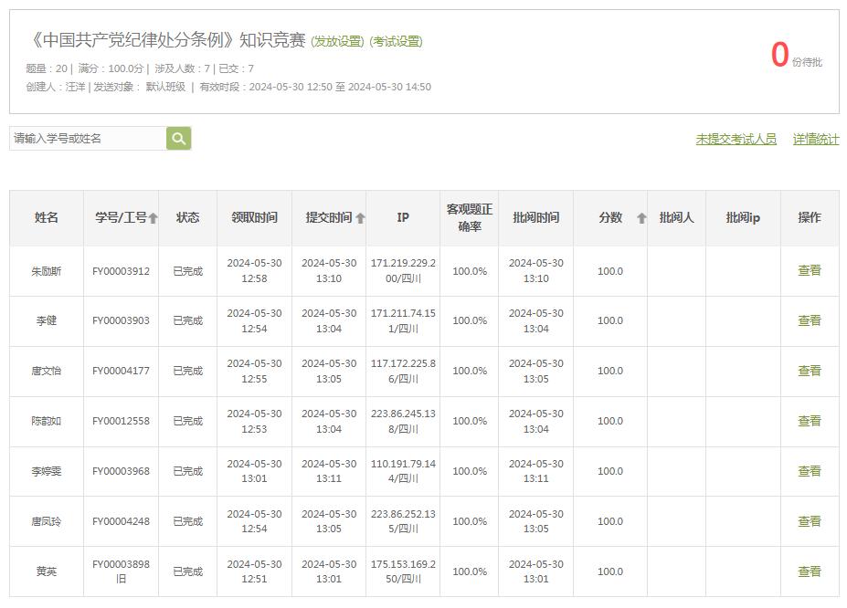 (本网讯汪洋报道)2024年5月30日,大学外语第三教研室党支部全体党员在5411围绕《中国共产党纪律处分条例》进行了本月的第三次专题学习,随后进行了《条例》相关的知识竞赛以检验学习成效。知识竞赛题包括15道单选题和5道多选题,共计20道,满分100分。在限定时间之内,支部全体党员均顺利完成竞赛答题且获得满分成绩,显示出良好的学习效果。