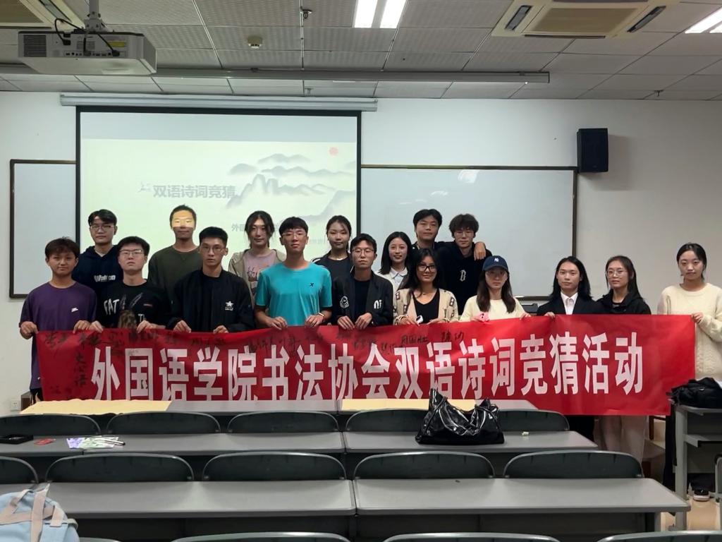 流光容易把人抛,静了夏蝉,落了秋叶。转眼间,秋风送爽,硕果累累。在这个季节里,一切都是浪漫的,一切都赋予了诗意。同学们既可以入堂即静,入座即学,在知识的海洋里畅游;也可以在操场上挥洒汗水,听歌漫步,更可以来一场紧张刺激的双语诗词竞猜比赛。 11月5日,为提升学生外语能力,弘扬中国传统诗词文化,营造浓厚的外院人文氛围,由beat365官方网站团委主办、学院书法小组承办的“双语诗词竞猜活动”在5教412教室成功举办。