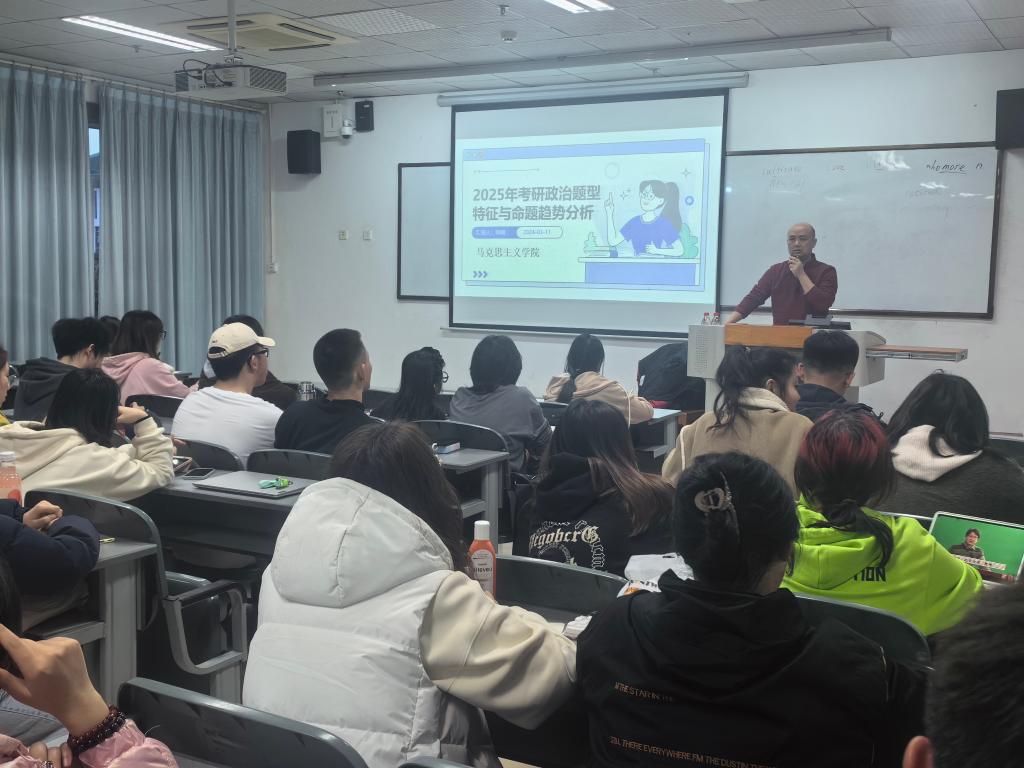 为扎实做好我院学生考研指导工作,帮助学生精准把握考研政治命题特点,beat365官方网站于3月11日晚7点在5教416举办了主题为“2025年考研政治题型特征与命题分析趋势分析”的讲座。此次讲座由马克思主义学院思想政治教研室主任帅刚副教授主讲,beat365官方网站团学办副主任叶奇奇主持,2021级辅导员伍家媛与2021级、2022级、2023级学生参与了本次讲座。